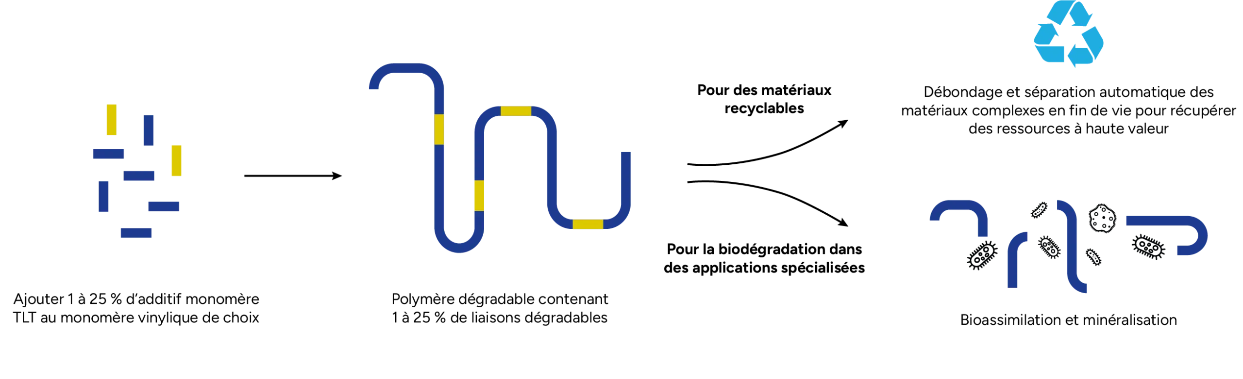 Utilisation des lignes de production de polymères existantes, sans aucune modification nécessaire pour fabriquer des polymères dégradables.